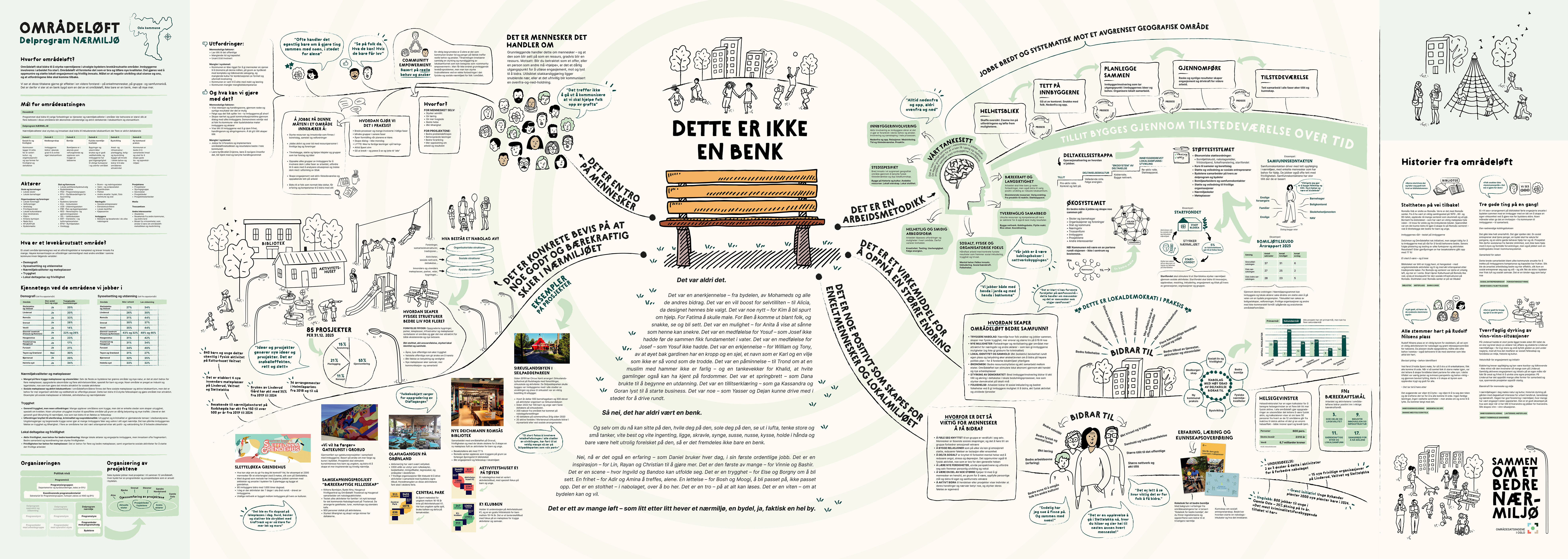Arbeidet ble gjennomført i tett samarbeid med prosjektledere fra de ulike områdeløftene, og et kjerneteam fra delprogram nærmiljø. Sammen jobbet vi med å dra ut essensen av mange års erfaring, forenkle og tydeliggjøre for å komme til kjernen av arbeidet, se viktige sammenhenger og effekter, og utvikle det visuelle konseptet. Helheten ble tydeliggjort gjennom fem tråder som løftet fram viktige elementer og synliggjorde kompleksiteten på en forståelig måte. Den ferdige leveransen ble et gigamap på 4,5 x 1,5 meter som ble presentert på en konferanse for politikere, beslutningstakere og ansatte i etater, foretak og bydeler i Oslo.