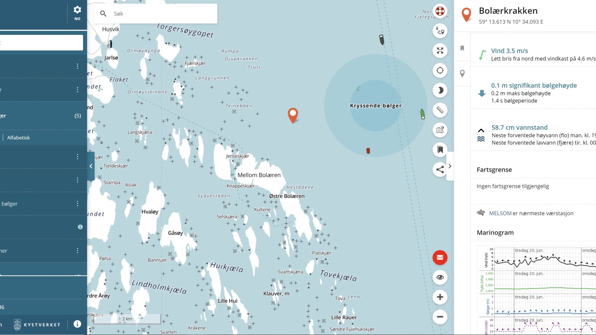 En nyttig funksjon er ruteplanleggeren, der du kan sjekke forholdene for den planlagte båtturen. Du tegner reiseruten i kartet, velger tidspunkt og får opp bølge-, vind- og strømvarsel for strekningen.